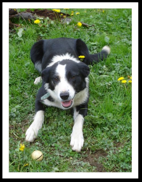Nos chiens trouvent que nous parlons trop des chevreaux, nous allons rattrapé cela. Calypso se met toujours dans cette position quand elle veut jouer avec nous. Elle est à l'affût.